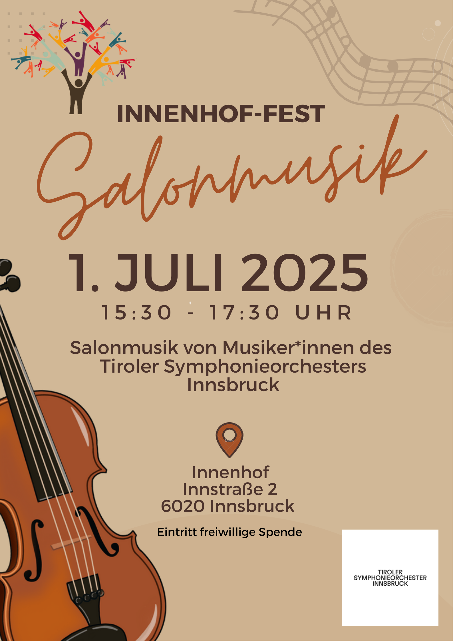 Mit Salonmusik von Musiker:innen des Tiroler Symphonieorchesters Innsbruck: Susanne Merth-Tomasi, Nilss Silkalns, Lucia Tenean, Albrecht Lippmann, Gerrit Prießnitz.